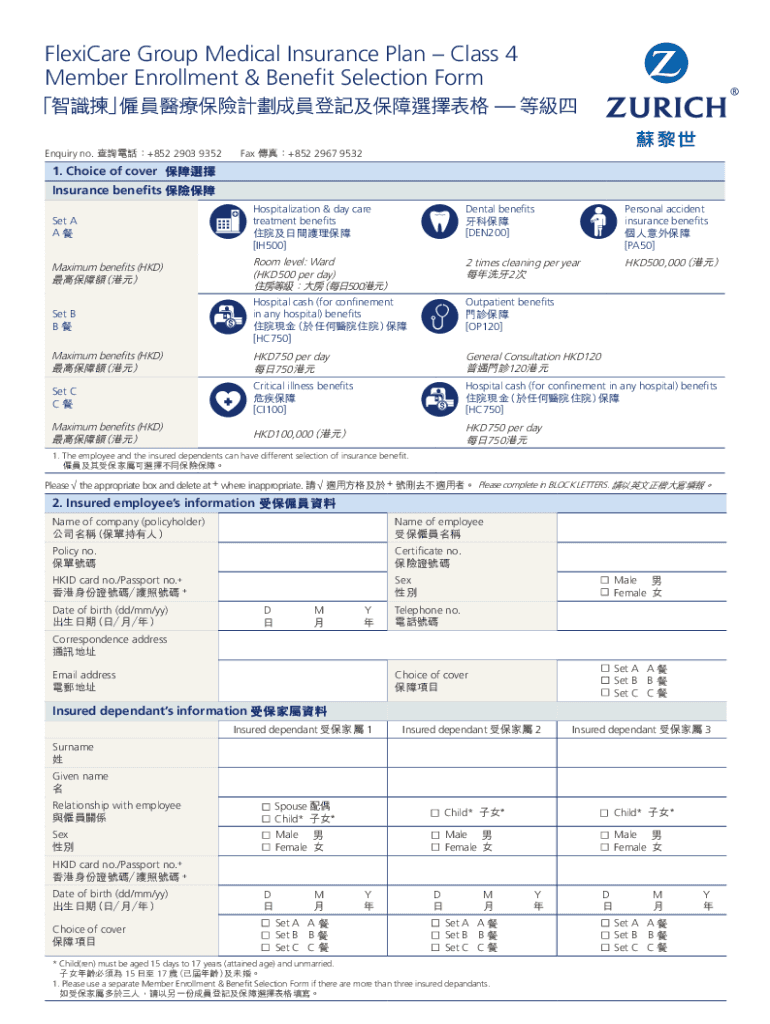 Flexible Group Medical Insurance Plan Class 4 Member Enrollment & Benefit Selection Form Inquiry no. +852 2903 9352Fax +852 2967 95321. Choice of cover Insurance benefits Set A Maximum benefits (HKD)