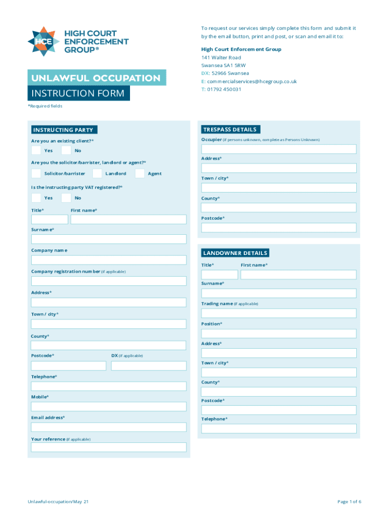 To request our services simply complete this form and submit it by the email button, print and post, or scan and email it to: High Court Enforcement Group 141 Walter Road Swansea SA1 5RWUNLAWFUL OCCUPATION: