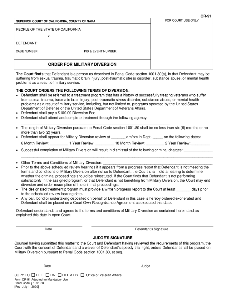 CR91 FOR COURT USE ONLYSUPERIOR COURT OF CALIFORNIA, COUNTY OF LAYPEOPLE OF THE STATE OF CALIFORNIA v. DEFENDANT: CASE NUMBER:PID & EVENT NUMBER:ORDER FOR MILITARY DIVERSION The Court finds that Defendant