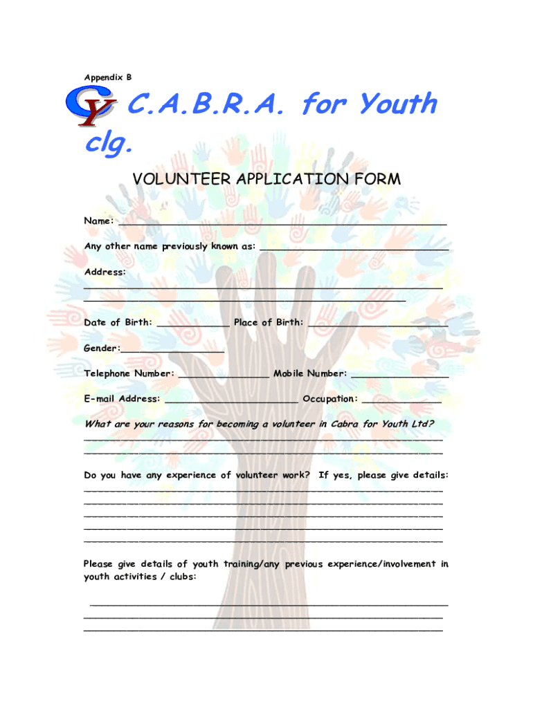 Appendix BC. A.B.R.A. for Youth CLG. VOLUNTEER APPLICATION FORM Name: Any other name previously known as: Address: Date of Birth: Place of Birth: Gender: Telephone Number: Mobile Number: Email Address: