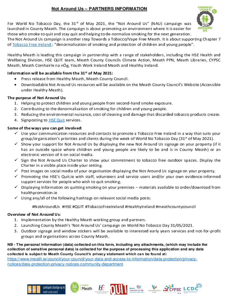 Not Around Us PARTNERS INFORMATION For World No Tobacco Day, the 31st of May 2021, the Not Around Us (NAU) campaign was launched in County Death. The campaign is about promoting an environment where