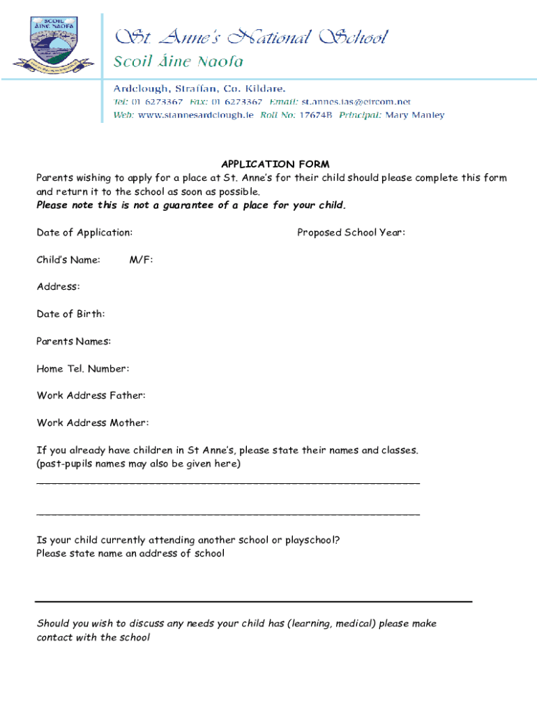 Parents wishing to apply for a place at St. Anne's for their child should please complete this form