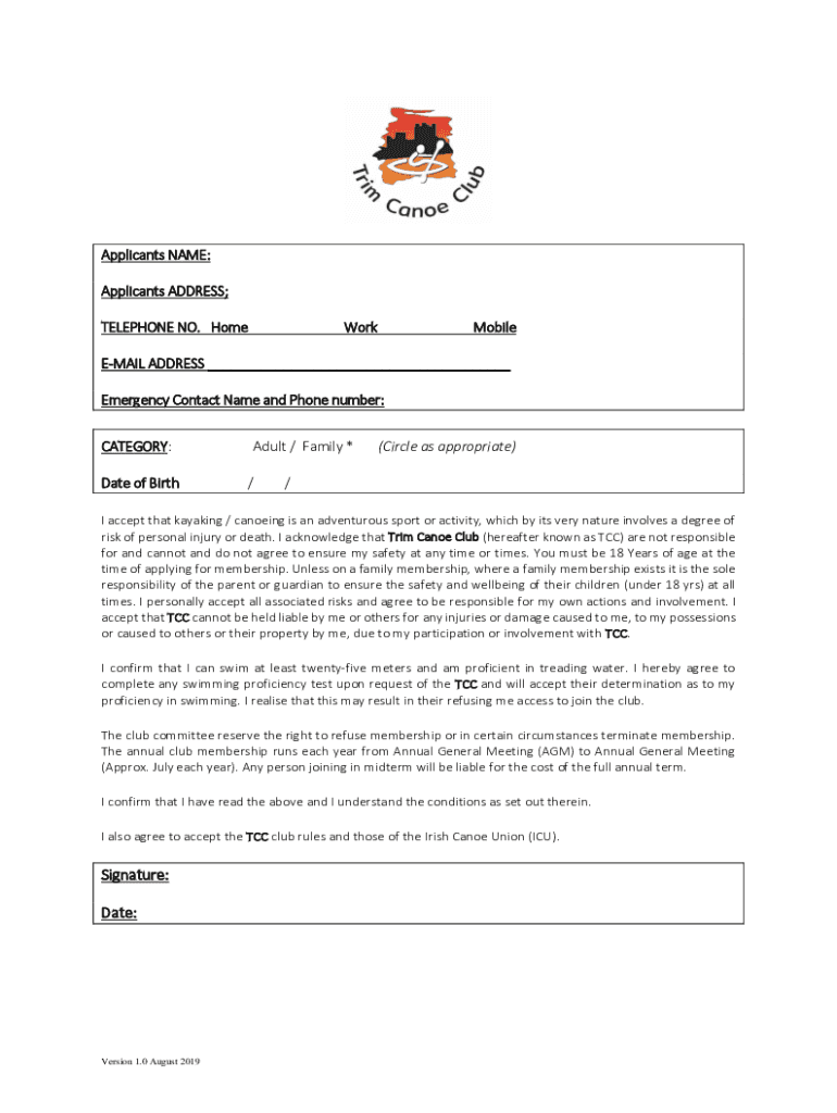 Applicants NAME: Applicants ADDRESS; TELEPHONE NO. HomeWorkMobileEMAIL ADDRESS Emergency Contact Name and Phone number: CATEGORY: Date of BirthAdult / Family * /(Circle as appropriate)/I accept that