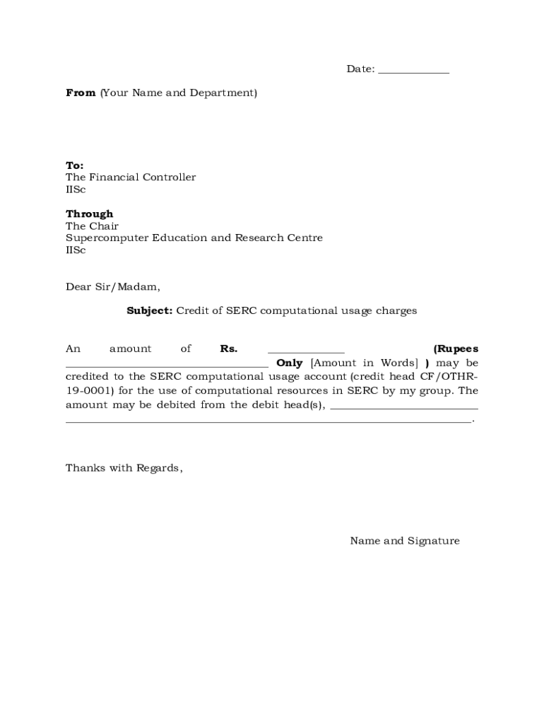 Date: From (Your Name and Department)To: The Financial Controller Disc Through The Chair Supercomputer Education and Research Center Disc Dear Sir/Madam, Subject: Credit of SERB computational usage