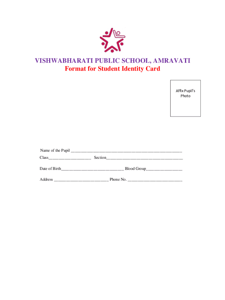 VISHWABHARATI PUBLIC SCHOOL, AMRAVATI Format for Student Identity Card Affix Pupils Photon of the Pupil Class Section Date of Birth Blood Group Address Phone No.
