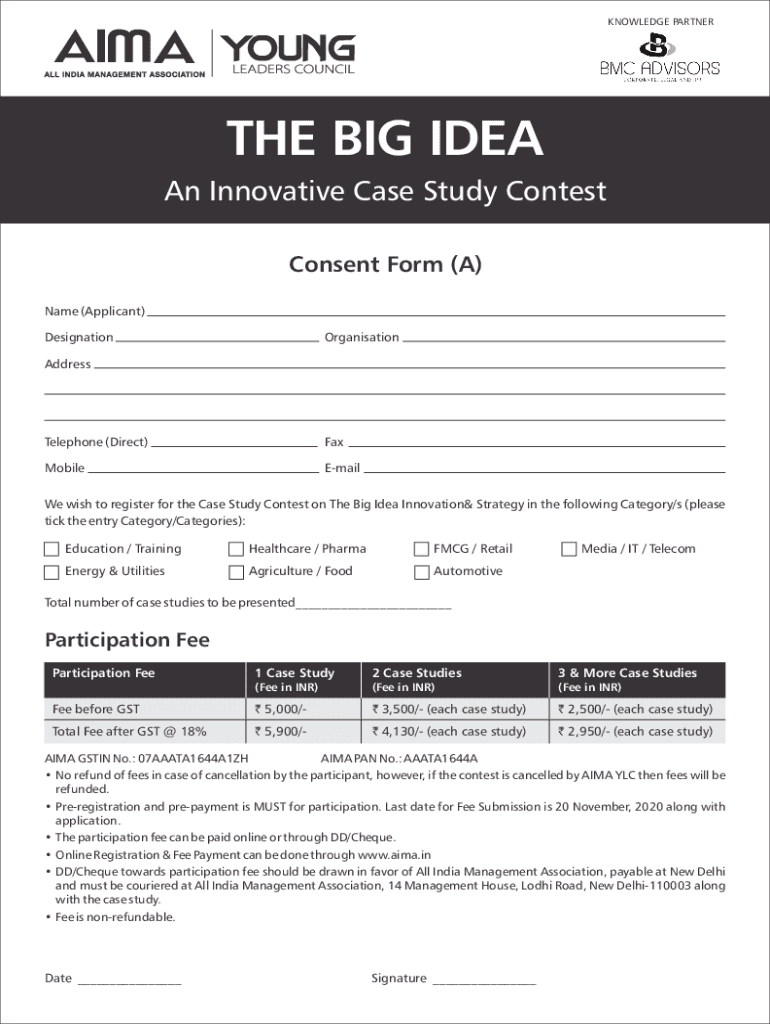 KNOWLEDGE PARTNER BIG IDEA An Innovative Case Study Contest Consent Form (A) Name (Applicant) DesignationOrganisationAddressTelephone (Direct)FaxMobileEmailWe wish to register for the Case Study Contest