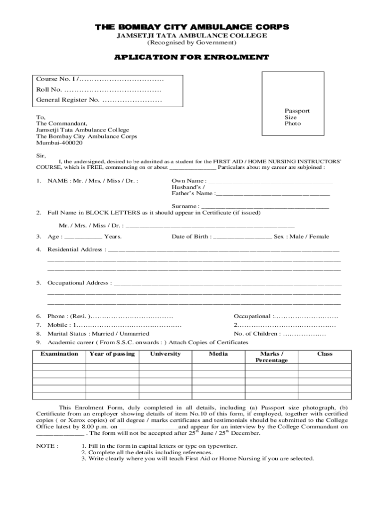 THE BOMBAY CITY AMBULANCE CORPS JAMSETJI TATA AMBULANCE COLLEGE (Recognized by Government)APPLICATION FOR Enrollment Course No. I /. Roll No. General Register No. Passport To, The Commandant, Jamsetji