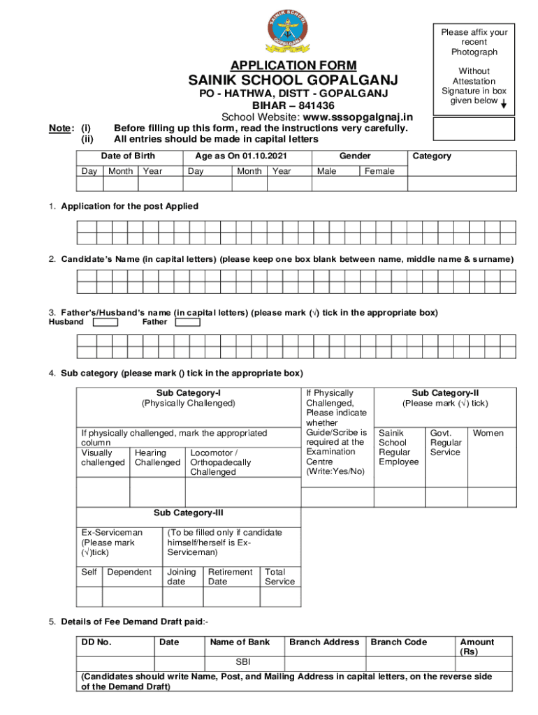 Please affix your recent PhotographAPPLICATION FORMWithout Attestation Signature in box given belowSAINIK SCHOOL GOPALGANJ PO HATH WA, DIST GOPALGANJ BIHAR 841436 School Website: www.sssopgalgnaj.in