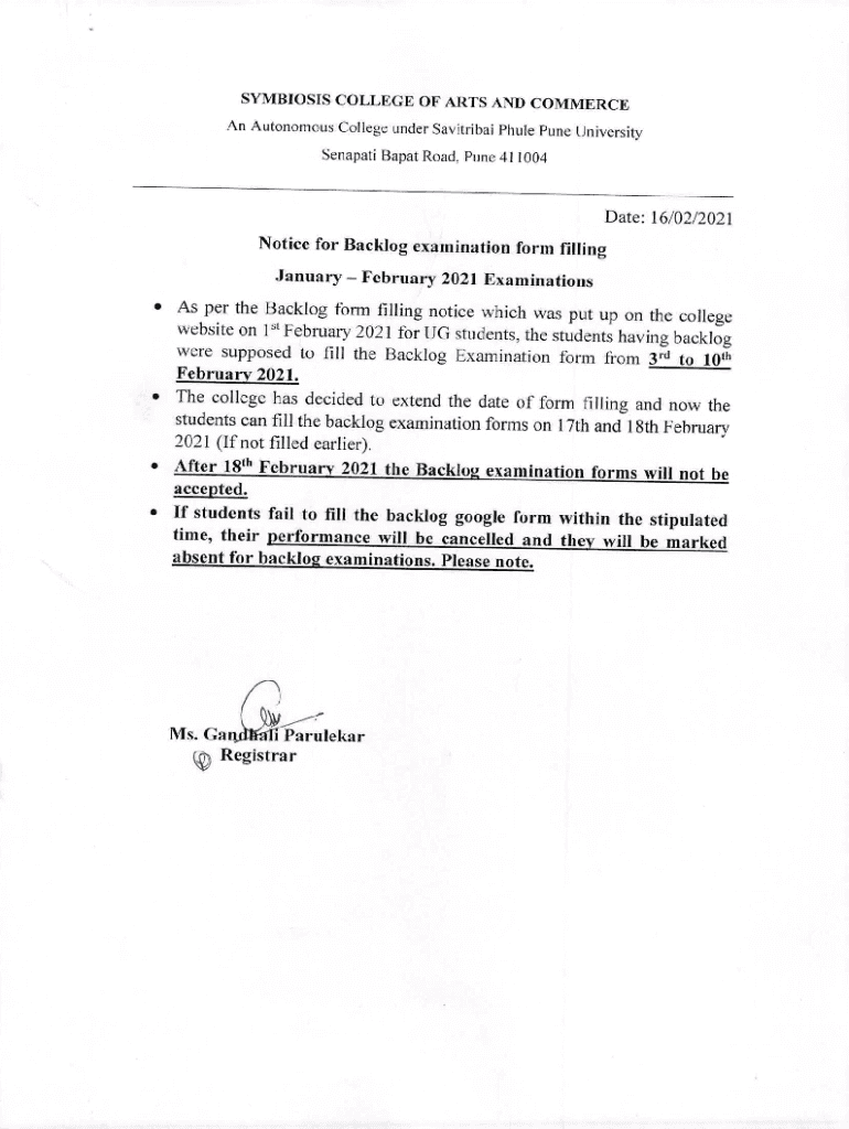 Get the free Notice for Backlog Exam Form Filling - symbiosiscollege edu