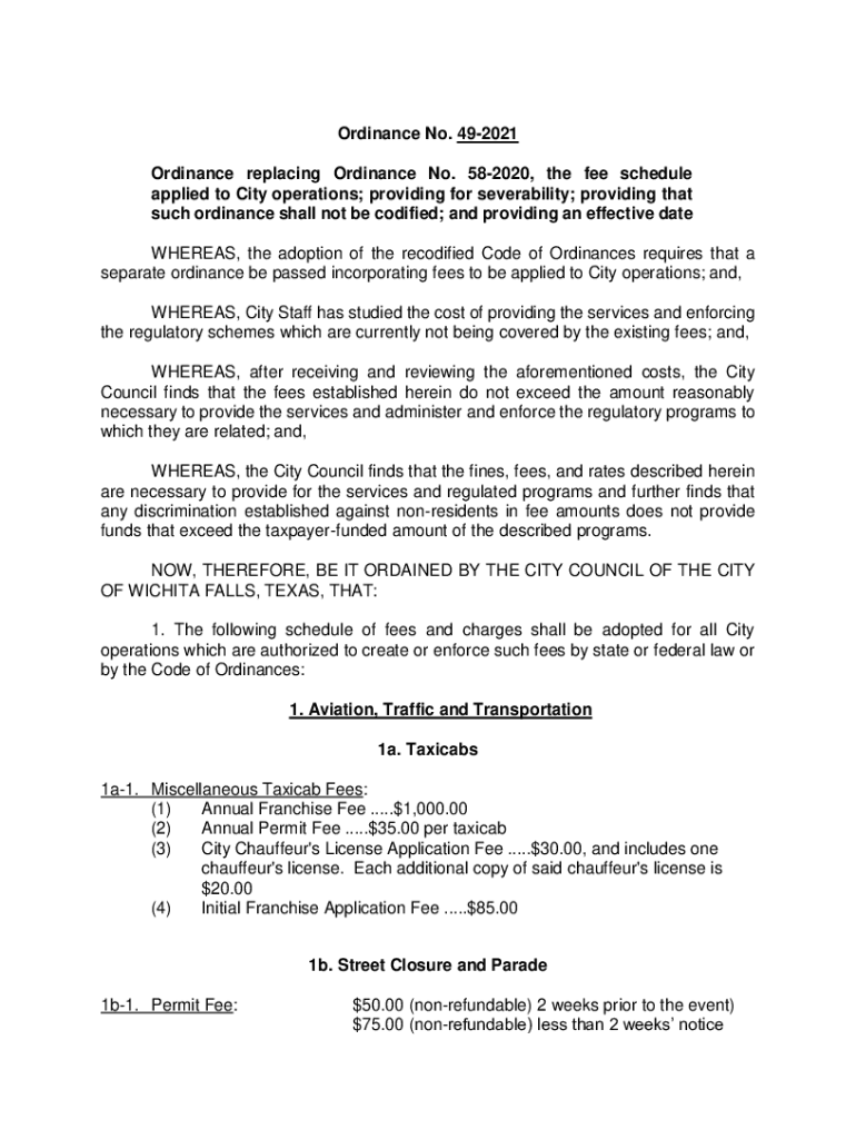 Ordinance No. 492021 Ordinance replacing Ordinance No. 582020, the fee schedule applied to City operations; providing for severability; providing that such ordinance shall not be codified; and providing