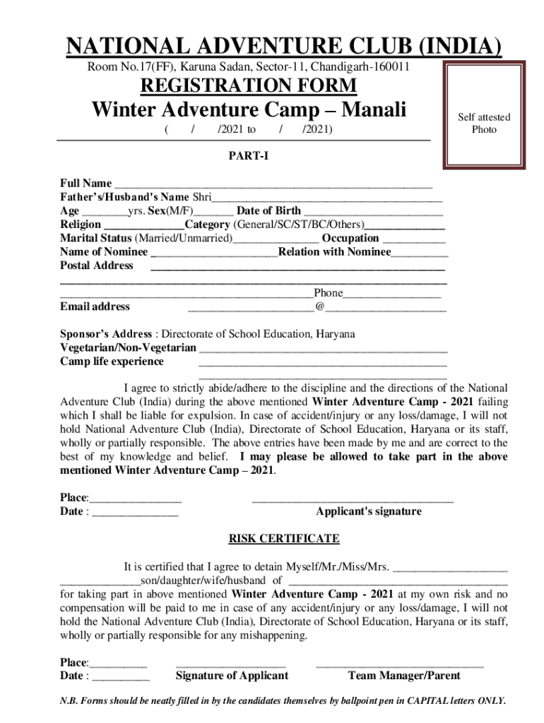 NATIONAL ADVENTURE CLUB (INDIA) Room No.17(FF), Karina Sudan, Sector11, Chandigarh160011REGISTRATION Forefinger Adventure Camp Canal (//2021 to//2021)Self attested PhotoPARTI Full Name Fathers/Husband's