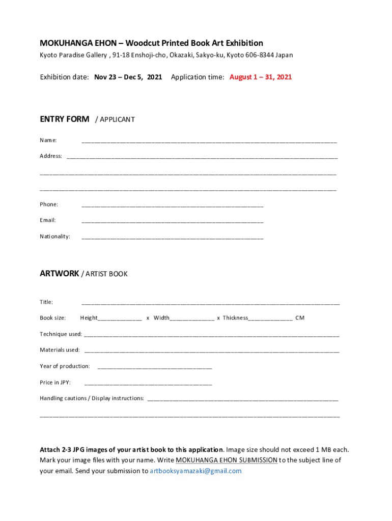 MOKUHANGAEHONWoodcutPrintedBookArtExhibition KyotoParadiseGallery,9118Enshojicho,Kazakh, Shikoku,Kyoto6068344Japan Exhibition date:Nov23Dec5,2021Applicationtime:August131,2021 ENTRYFORM/APPLICANT