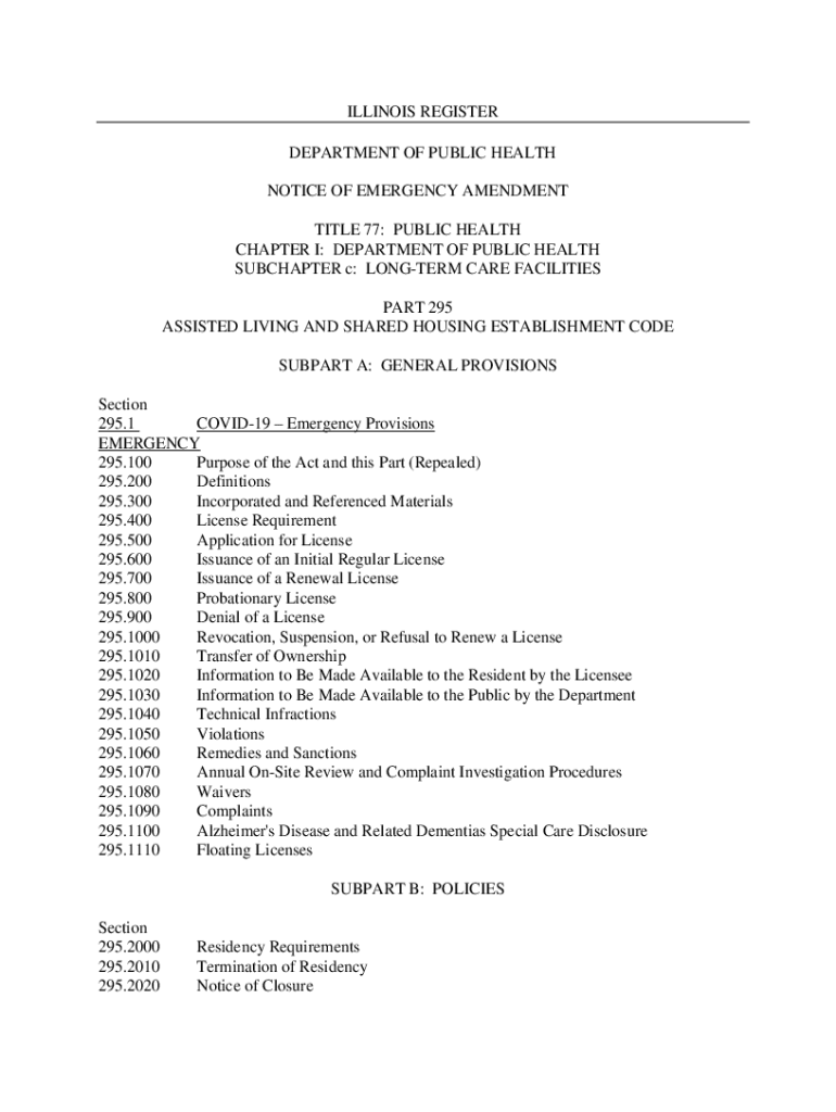 ILLINOIS REGISTER DEPARTMENT OF PUBLIC HEALTH NOTICE OF EMERGENCY AMENDMENT TITLE 77: PUBLIC HEALTH CHAPTER I: DEPARTMENT OF PUBLIC HEALTH SUBCHAPTER c: LONGER CARE FACILITIES PART 295 ASSISTED LIVING