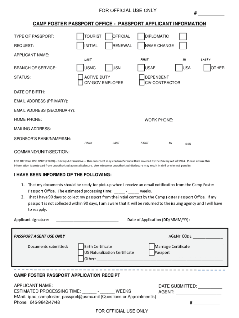 FOR OFFICIAL USE ONLY# CAMP FOSTER PASSPORT OFFICE PASSPORT APPLICANT INFORMATION TYPE OF PASSPORT:TOURISTOFFICIALDIPLOMATICREQUEST:INITIALRENEWALNAME CHANGEAPPLICANT NAME: LASTMIFIRSTBRANCH OF SERVICE:USMCSTATUS:ACTIVE