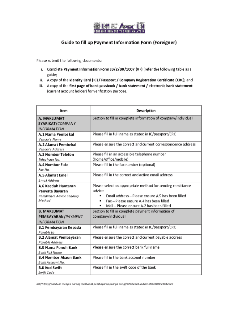 GuidetofillupPaymentInformationForm(Foreigner) Pleasesubmitthefollowingdocuments: i. CompletePaymentInformationFormJB/2/BR/1007(VF)(referthefollowingtableasa guide; ii. AcopyoftheIdentityCard(IC)/Passport/CompanyRegistrationCertificate(CRC);and