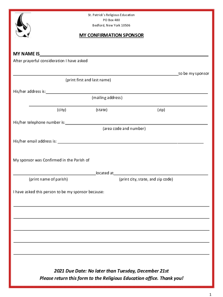 St. Patrick's Religious Education PO Box 480 Bedford, New York 10506MY CONFIRMATION SPONSOR MY NAME IS After prayerful consideration I have asked to be my sponsor (print first and last name) His/her