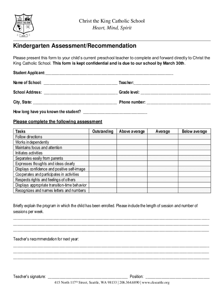 Christ the King Catholic School Heart, Mind, SpiritKindergarten Assessment/Recommendation Please present this form to your children current preschool teacher to complete and forward directly to Christ