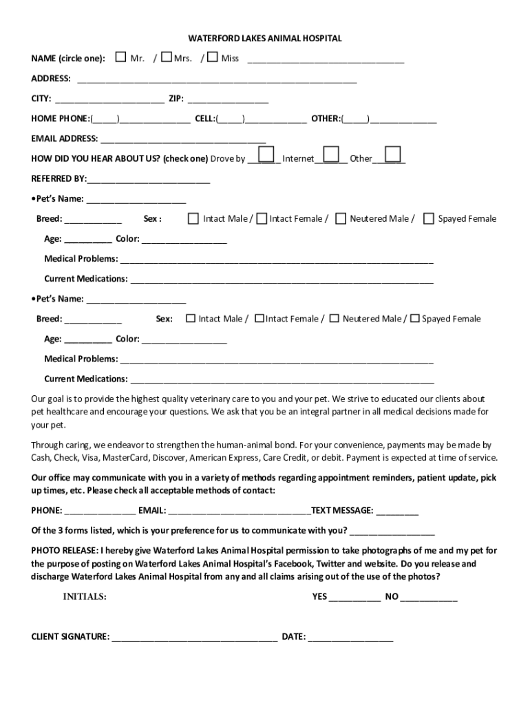 WATERFORD LAKES ANIMAL HOSPITAL NAME (circle one):Mr. /Mrs. /Miss ADDRESS: CITY: ZIP: HOME PHONE:() CELL:() OTHER:() EMAIL ADDRESS: HOW DID YOU HEAR ABOUT US? (check one) Drove by Internet Other REFERRED