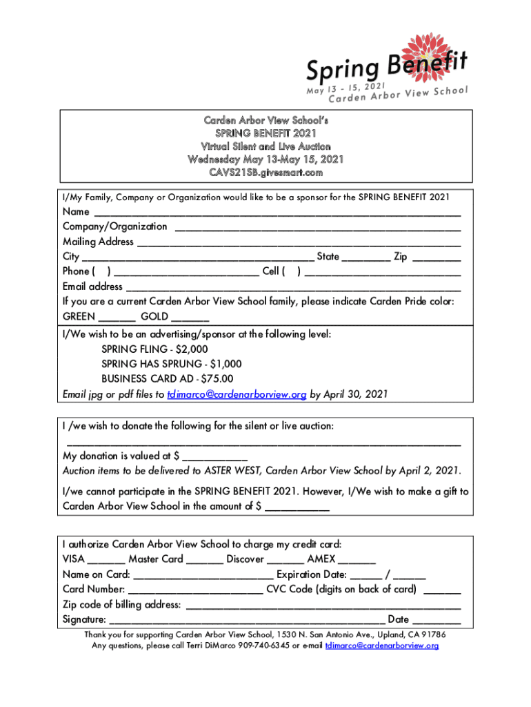 Garden Arbor View Schools SPRING BENEFIT 2021 Virtual Silent and Live Auction Wednesday May 13May 15, 2021 CAVS21SB.givesmart.com I/My Family, Company or Organization would like to be a sponsor for