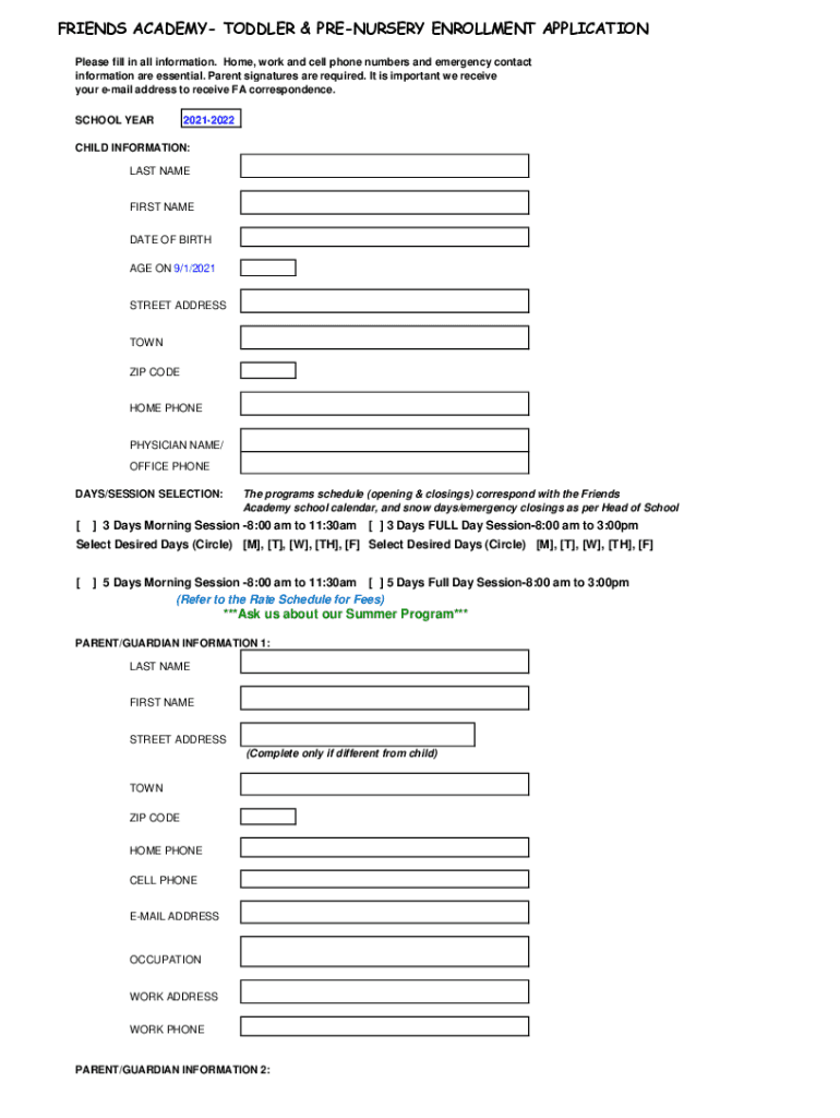 To fill out Friends Academy- Toddler &, parents or guardians must provide information about their child, emergency contacts, and medical history.