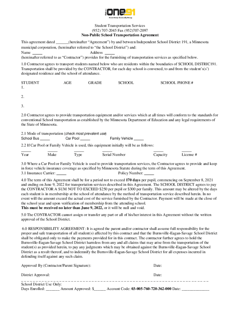 Student Transportation Services (952) 7072045 Fax (952)7072097 Nonpublic School Transportation Agreement This agreement dated (hereinafter Agreement) by and between Independent School District 191,
