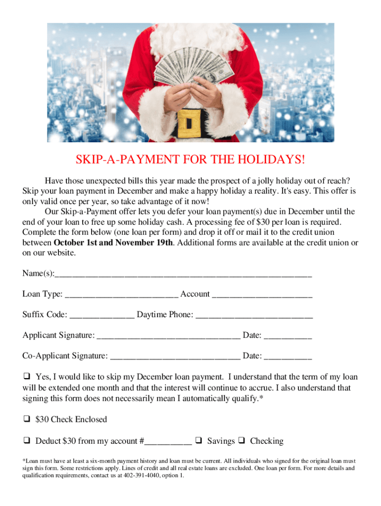 SKIPAPAYMENT FOR THE HOLIDAYS! Have those unexpected bills this year made the prospect of a jolly holiday out of reach? Skip your loan payment in December and make a happy holiday a reality. It\'s