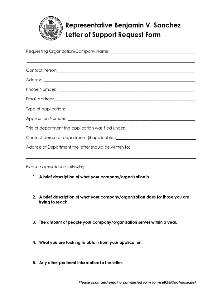 Representative Benjamin V. Sanchez Letter of Support Request Form Requesting Organization/Company Name: Contact Person: Address: Phone Number: Email Address: Type of Application: Application Number: