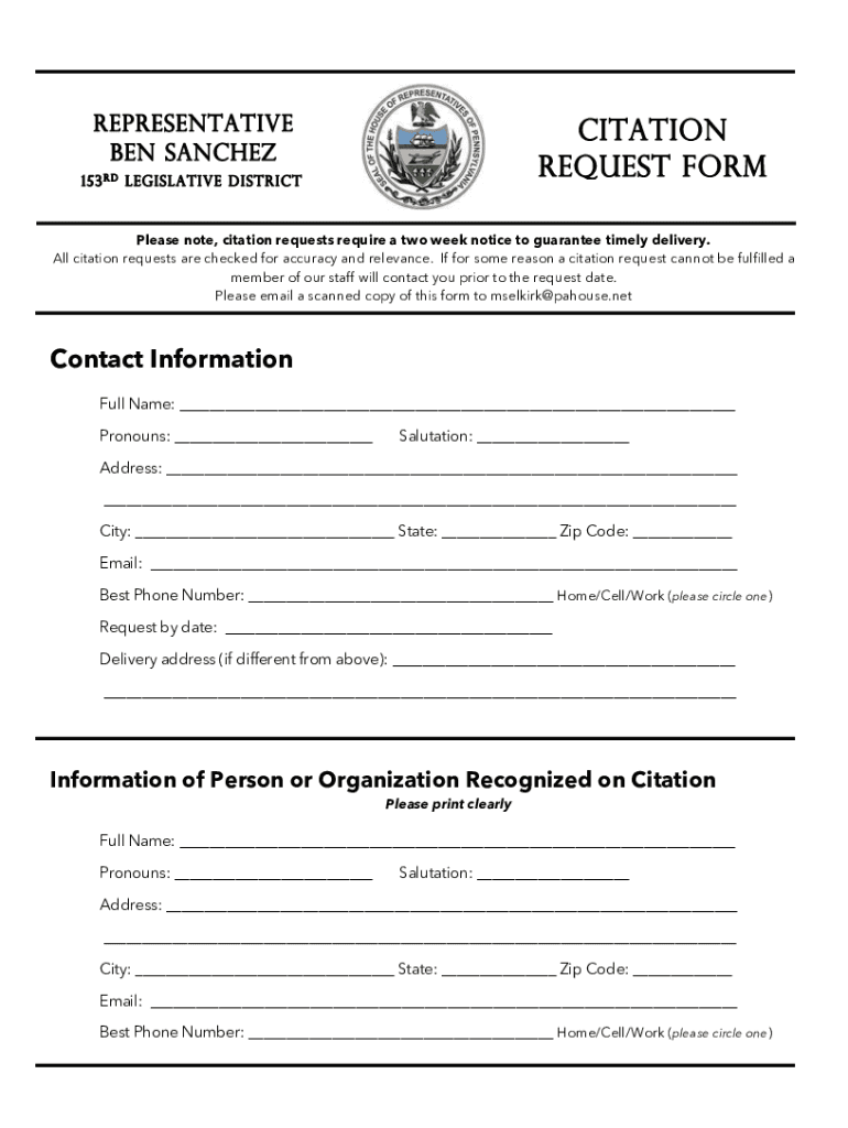 Get the free Please note, citation requests require a two week notice to guarantee timely delivery