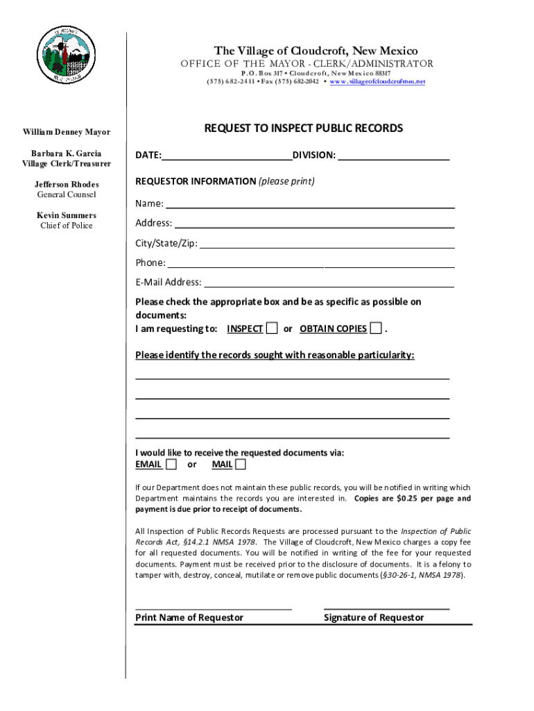 The Village of Cloud croft, New MexicoOFFICE OF THE MAYOR CLERK/ADMINISTRATOR P. O. Box 317 Cloud croft, New Mexico 88317 (575) 6822411 Fax (575) 6822042 www.villageofcloudcroftnm.netREQUEST TO INSPECT