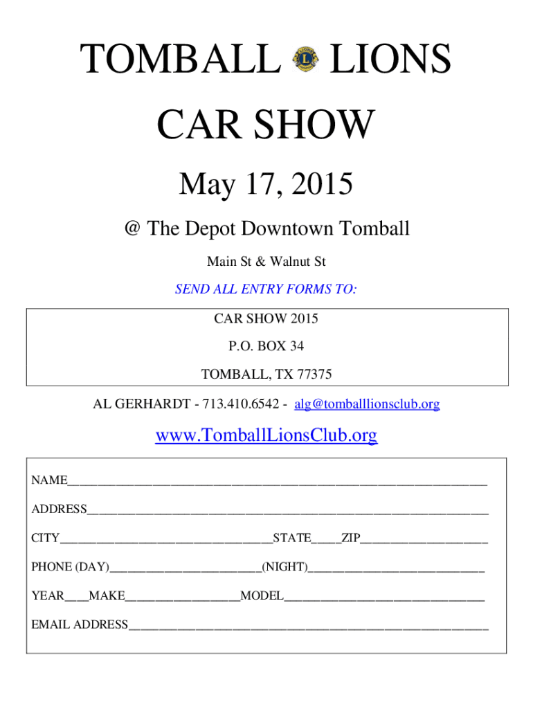 TOMBALLLIONSCAR SHOW May 17, 2015, The Depot Downtown Tom ball Main St & Walnut St Sends ALL ENTRY FORMS TO: CAR SHOW 2015 P.O. BOX 34 TOMB ALL, TX 77375 AL GERHARD 713.410.6542 ALG tomballlionsclub.organ.TomballLionsClub.org