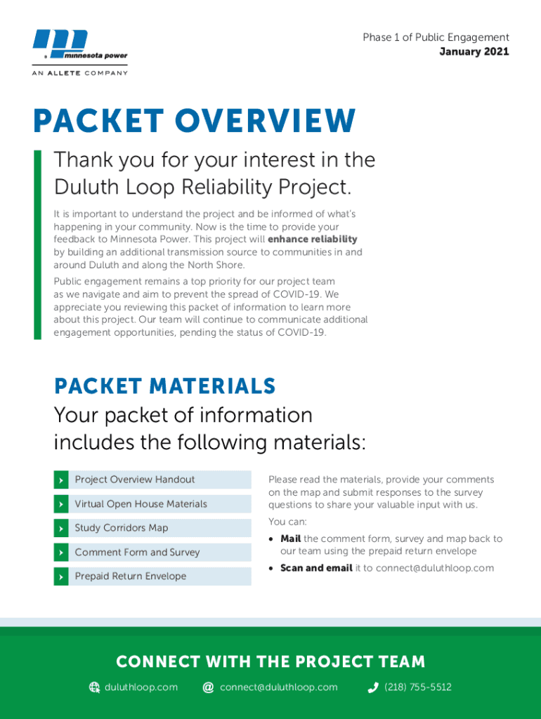 Phase 1 of Public Engagement January 2021PACKET OVERVIEW Thank you for your interest in the Duluth Loop Reliability Project. It is important to understand the project and be informed of what's happening