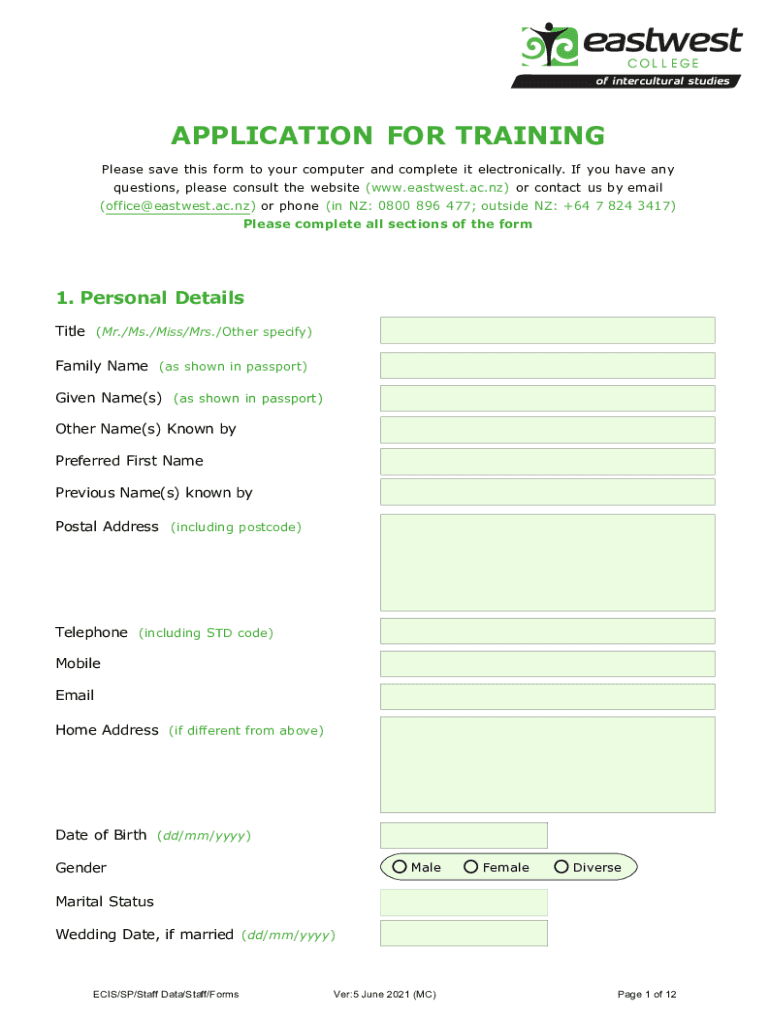 APPLICATION FOR TRAINING Please save this form to your computer and complete it electronically. If you have any questions, please consult the website (www.eastwest.ac.nz) or contact us by email (office@eastwest.ac.nz)