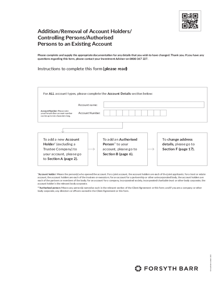 Addition/Removal of Account Holders/ Controlling Persons/Authorized Persons to an Existing Account Please complete and supply the appropriate documentation for any details that you wish to have changed.