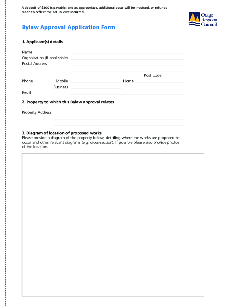 A deposit of $300 is payable, and as appropriate, additional costs will be invoiced, or refunds made to reflect the actual cost incurred. Bylaw Approval Application Form 1. Applicant(s) details Name