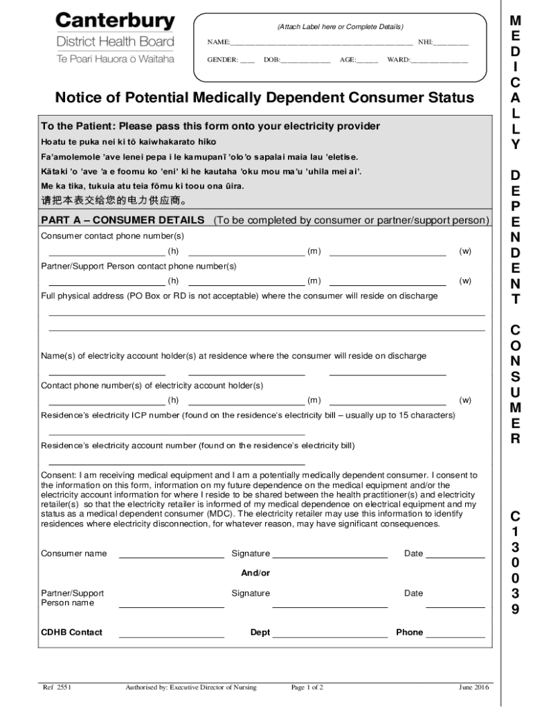 (Attach Label here or Complete Details) NAME: NHS: GENDER: DOB: AGE: WARD: Notice of Potential Medically Dependent Consumer Status To the Patient: Please pass this form onto your electricity provider