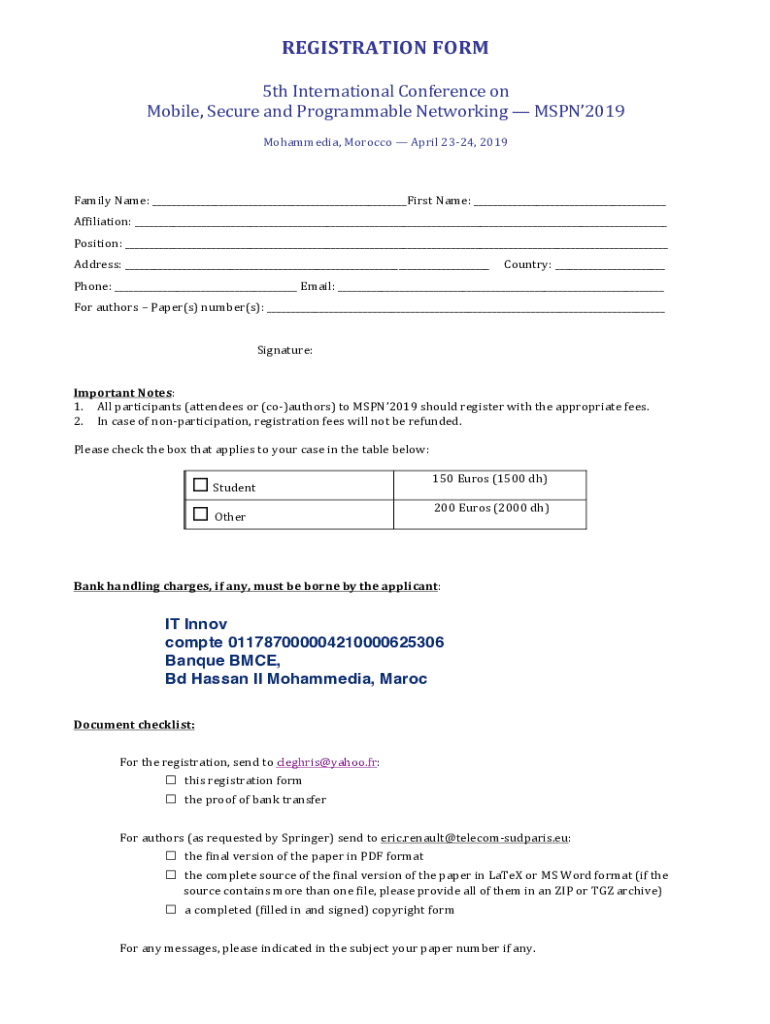 REGISTRATION FORM5th International Conference on Mobile, Secure and Programmable Networking MSPN2019Mohammedia, Morocco April 2324, 2019Family Name: First Name: Affiliation: Position: Address: Country:
