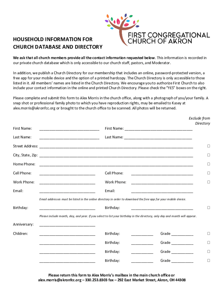 HOUSEHOLD INFORMATION FOR CHURCH DATABASE AND DIRECTORY We ask that all church members provide all the contact information requested below. This information is recorded in our private church database