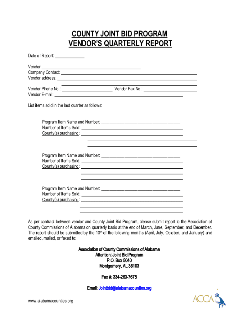 COUNTY JOINT BID PROGRAM VENDORS QUARTERLY REPORT Date of Report: Vendor: Company Contact: Vendor address: Vendor Phone No.: Vendor Email:Vendor Fax No.:List items sold in the last quarter as follows:
