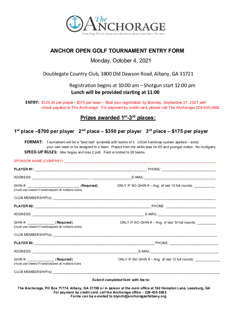 ANCHOR OPEN GOLF TOURNAMENT ENTRY FORM Monday, October 4, 2021, Double gate Country Club, 3800 Old Dawson Road, Albany, GA 31721 Registration begins at 10:00 am Shotgun start 12:00 pm Lunch will be