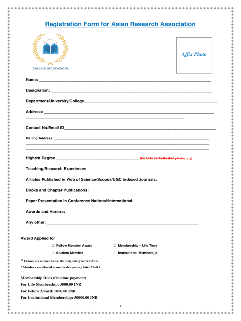Registration Form for Asian Research AssociationAffix Photon: Designation: Department/University/College Address: Contact No/Email ID Mailing Address: The Highest Degree (Include self attested photocopy)