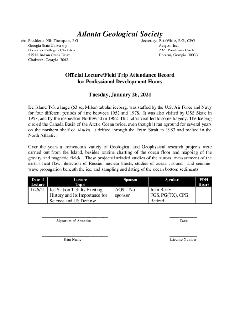 Atlanta Geological Society c/o President: Nils Thompson, P.G. Georgia State University Perimeter College Clarkson 555 N. Indian Creek Drive Clarkson, Georgia 30021Secretary: Rob White, P.G., CPG Argon,