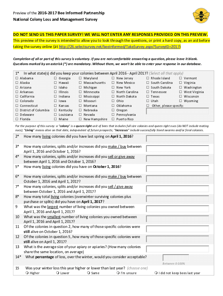 Preview of the 20162017 Bee Informed PartnershipNational Colony Loss and Management Survey DO NOT SEND US THIS PAPER SURVEY! WE WILL NOT ENTER ANY RESPONSES PROVIDED ON THIS PREVIEW. This preview