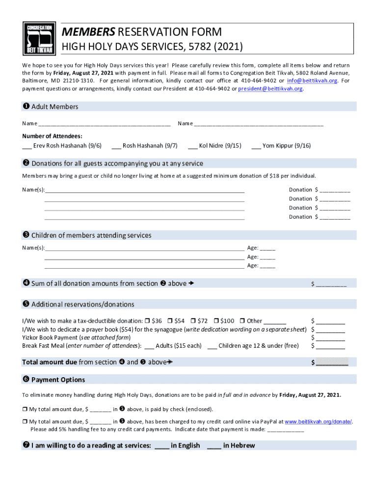 MEMBERS RESERVATION FOREIGN HOLY DAYS SERVICES, 5782 (2021)We hope to see you for High Holy Days services this year! Please carefully review this form, complete all items below and return the form by Friday, August 27, 2021, with payment in full.
