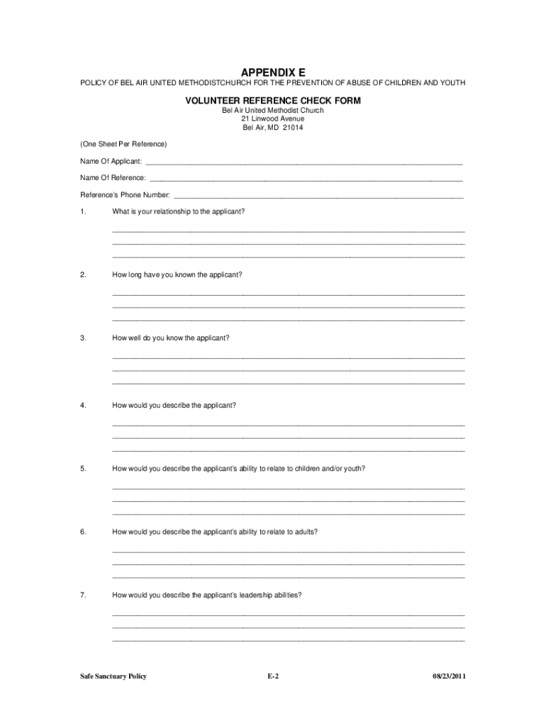 APPENDIX E POLICY OF BEL AIR UNITED METHODISTCHURCH FOR THE PREVENTION OF ABUSE OF CHILDREN AND YOUTHVOLUNTEER REFERENCE CHECK FORM Bel Air United Methodist Church 21 Linwood Avenue Bel Air, MD 21014