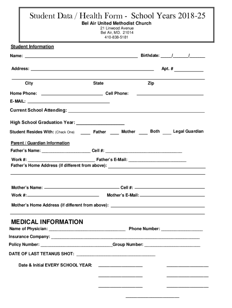 Student Data / Health Form School Years 201825 Bel Air United Methodist Church 21 Linwood Avenue Bel Air, MD. 21014 4108385181Student Information Birthdate: / / Name: Address:City Home Phone:Apt.