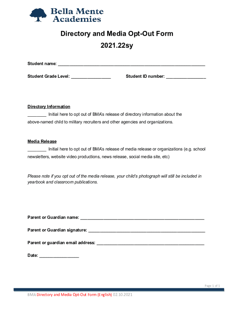 Directory and Media Opt-out Form 2021.22sy Student name: Student Grade Level: Student ID number: Directory Information Initial here to opt out of Bias release of directory information about the above