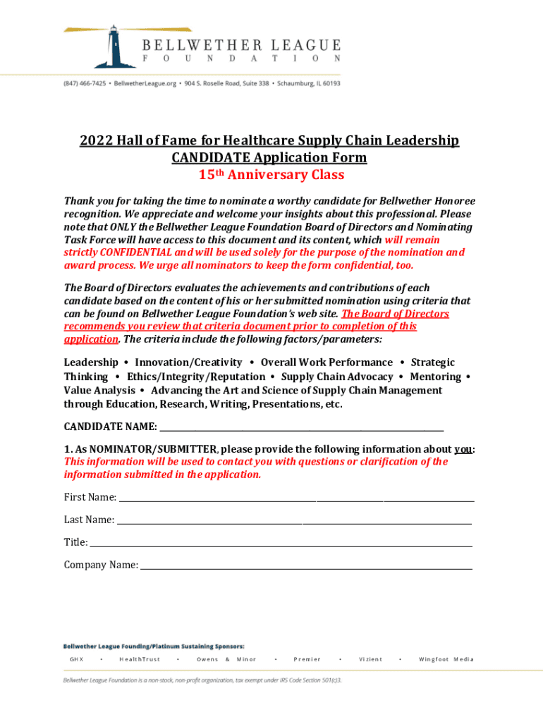 2022 Hall of Fame for Healthcare Supply Chain Leadership CANDIDATE Application Form 15th Anniversary Class Thank you for taking the time to nominate a worthy candidate for Bellwether Honoree recognition.