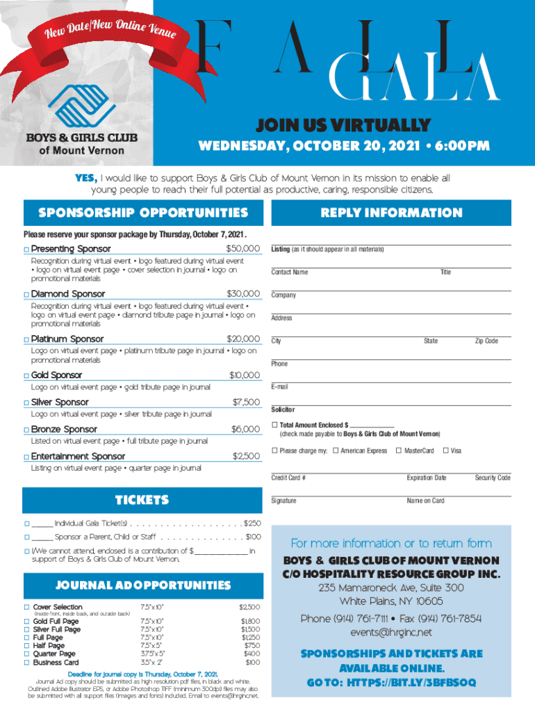Date/New Online Venue New a Gala l Join us Virtually Wednesday, October 20, 2021 6:00pm Yes, I would like to support Boys & Girls Club of Mount Vernon in its mission to enable all young people to