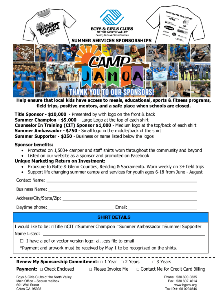 CA Boys & Girls Clubs of the North Valley Summer Services Sponsorships 2021-2025 free printable template