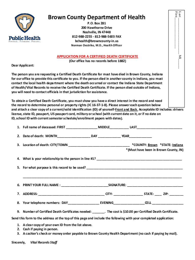 Norman Strike, M.D., Health OfficerAPPLICATION FOR A CERTIFIED DEATH CERTIFICATE (Our office has no records before 1882) Dear Applicant: The person you are requesting a Certified Death Certificate